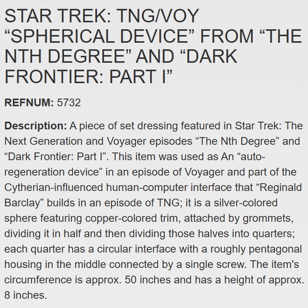 On October 5th 2007, more than 20 years after it was originally created for the #MacGyver episode "To Be a Man" and after it had appeared in numerous episodes, the sphere was sold for $607.62 as part of the It's A Wrap #StarTrek auction. Here's a clear photo of the sphere and its auction listing. This photo allows us to identify its original purpose in the MacGyver episode: 7/8