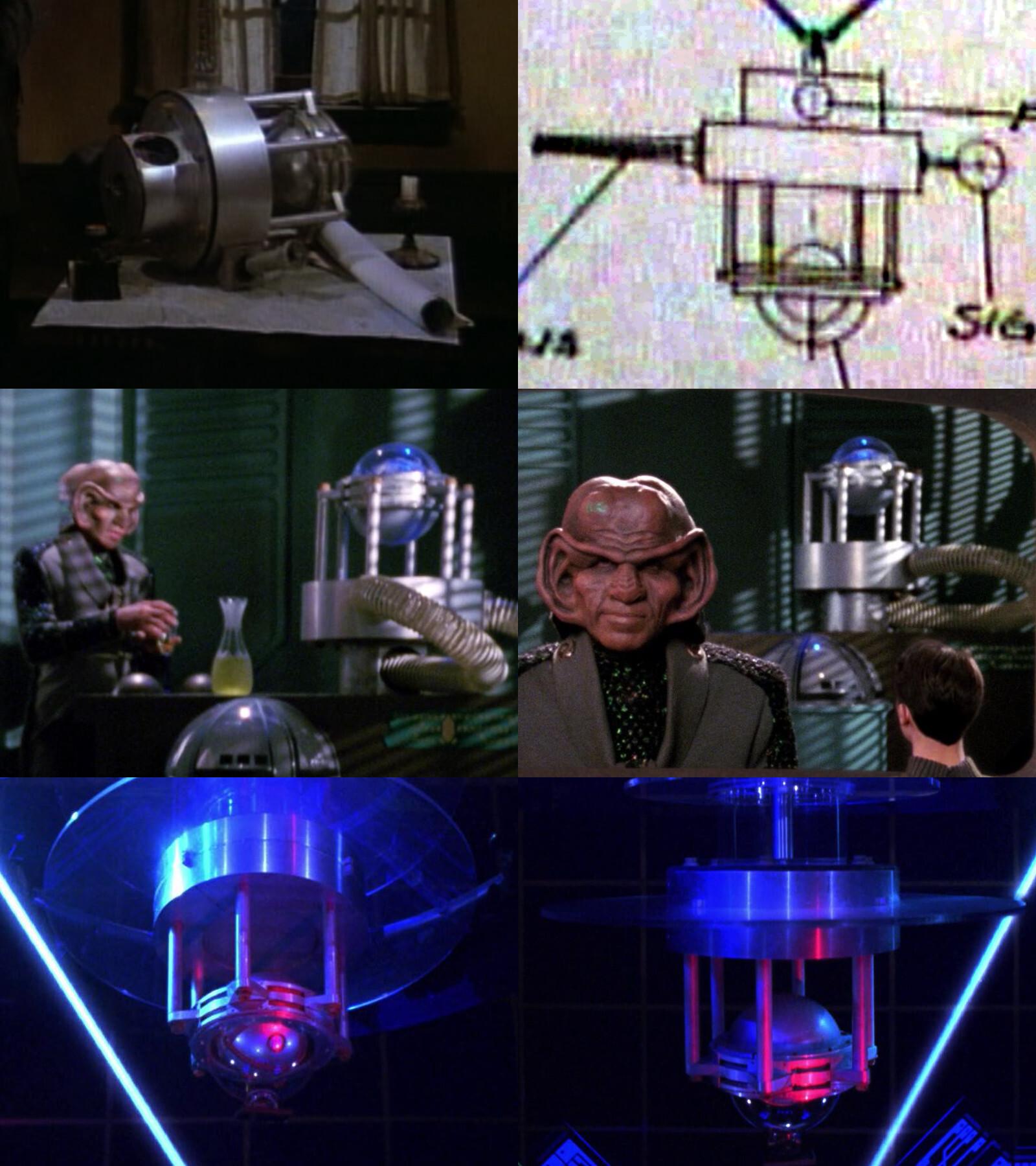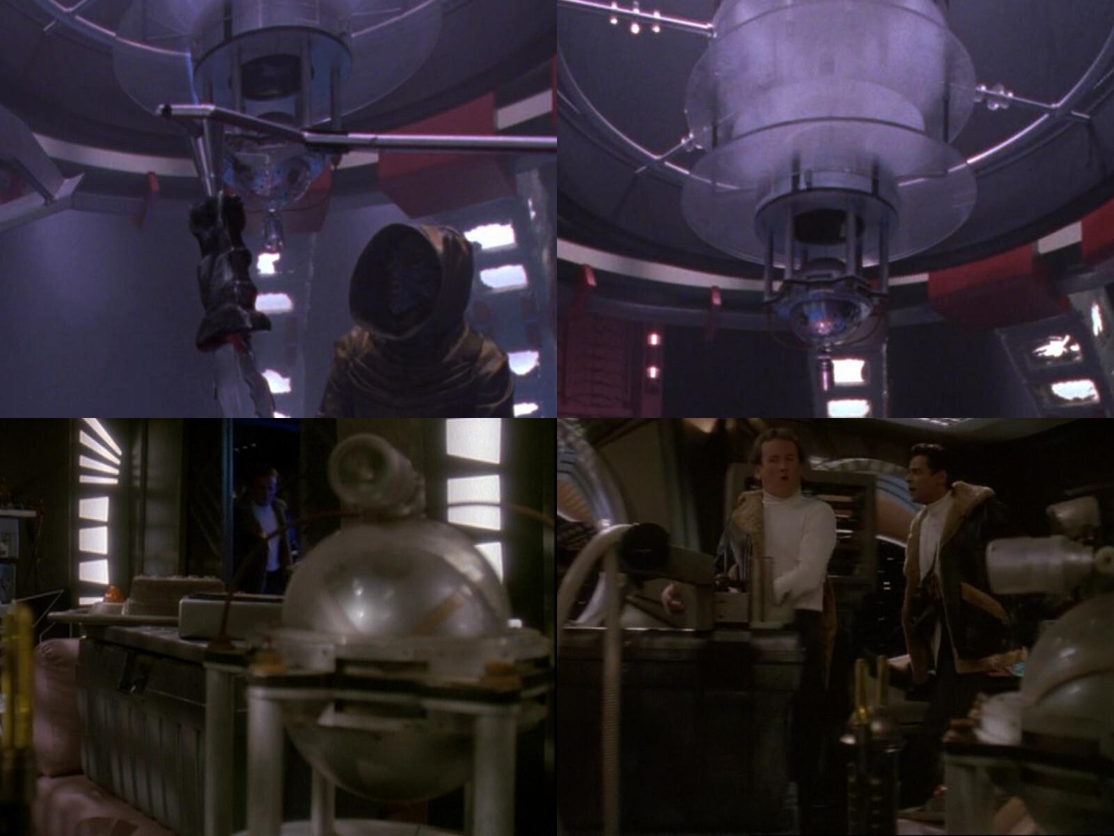 In 1990, the Rogallo satellite (from the #MacGyver episode "To Be a Man"⬆️) is first seen on #StarTrek as a Ferengi device on DaiMon Tog's Marauder in #StarTrekTNG's "Ménage à Troi"⬅️➡️. In this episode, it is almost unchanged since its debut 4 years earlier in #MacGyver. After that, it's seen again one year later in "The Nth Degree"⬇️ as part of Barclay's holographic interface. 3/8