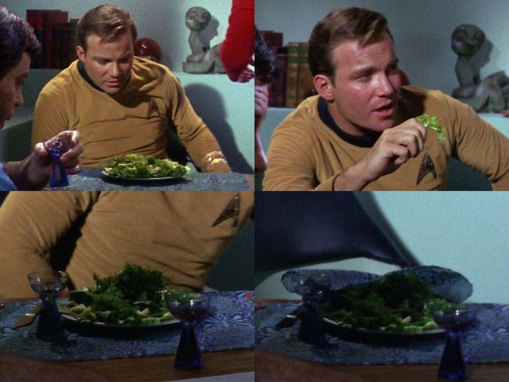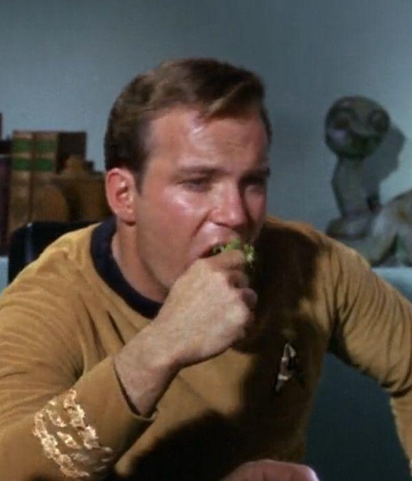 The first (as in production order) actual (not illusionary or created using super-powers) food, eaten aboard the USS Enterprise in a #StarTrek episode, are the "green leaves" that Kirk nibbles on in #StarTrekTOS' "The Corbomite Maneuver". I need help: what vegetables are those? 😅