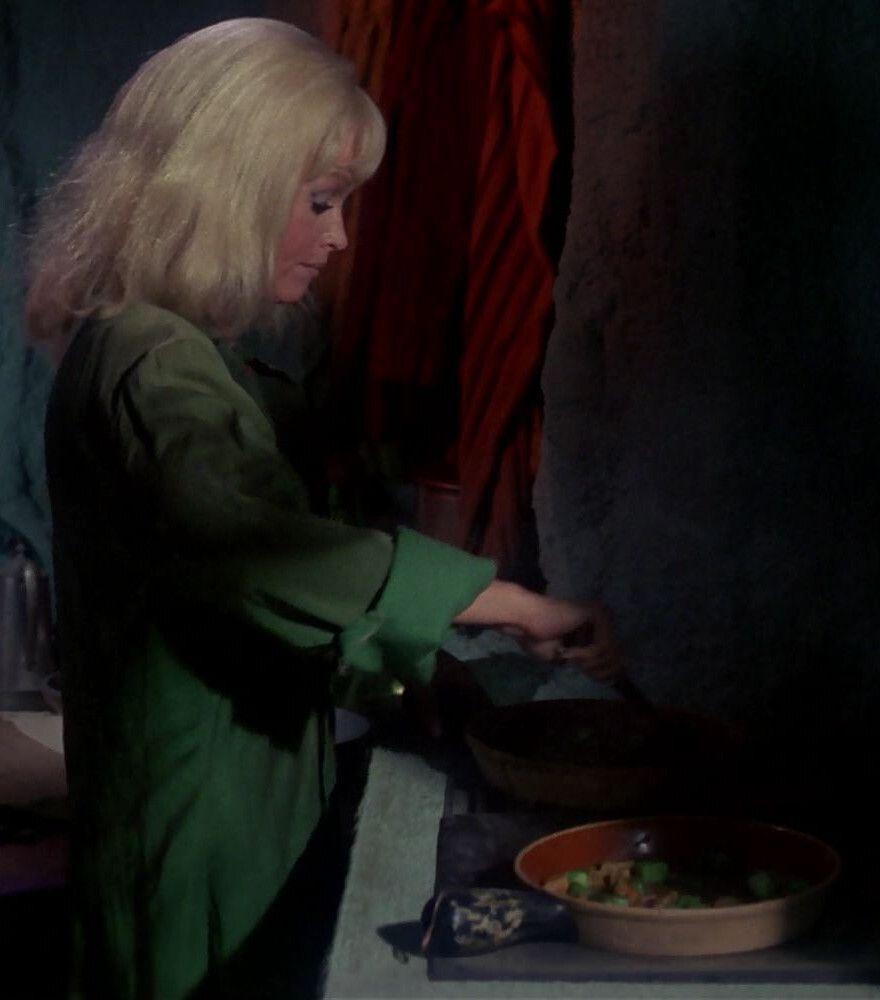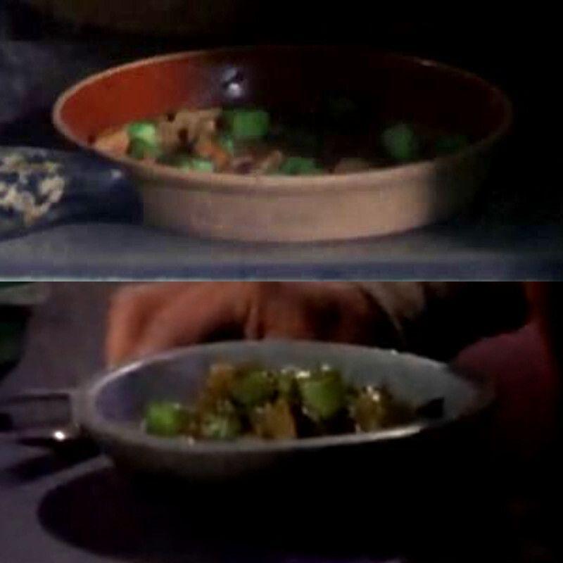 #StarTrekTOS' "Mudd's Women" is the first #StarTrek episode that features (roughly) cube-shaped food. In this episode, Eve McHuron is preparing a meal, consiting of green vegetable cubes and meat (what would you call this?), for Rigel XII miner Ben Childress. Won't be long till we get the proper first colourful food cubes! :-)
