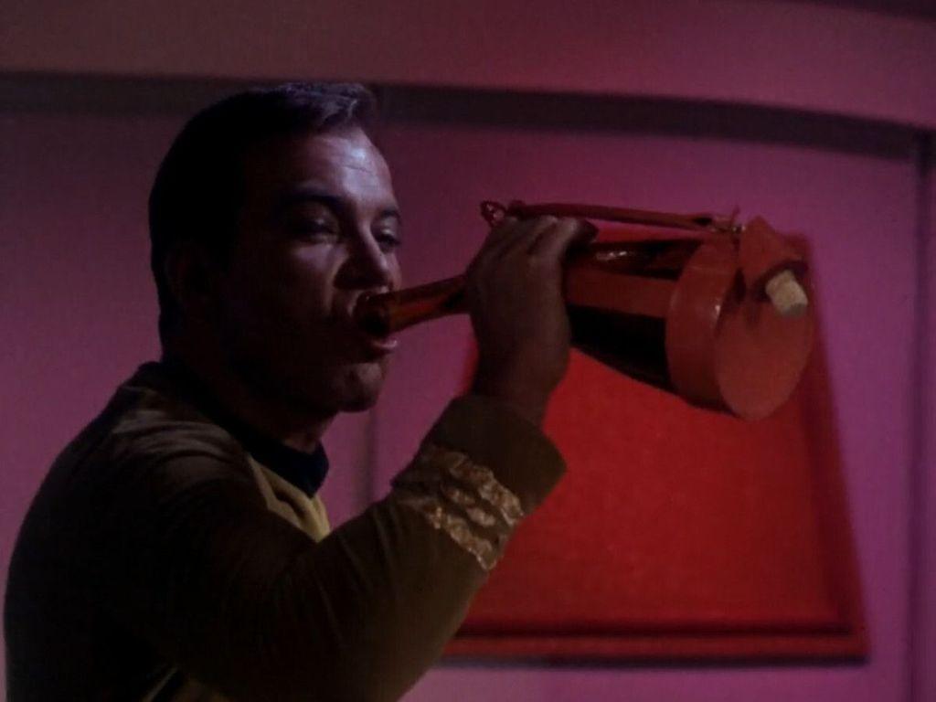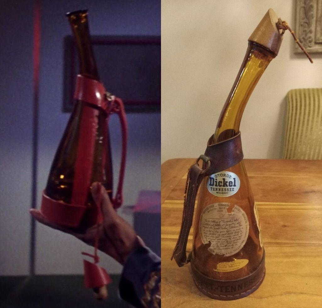 #StarTrekTOS' "The Enemy Within" is the first #StarTrek episode in which the famed Saurian brandy appears. Originally, the easily recognizable bottle was a 1964 George Dickel Tennessee Whisky bottle ➡️, modified for the show and seen in numerous later episodes.