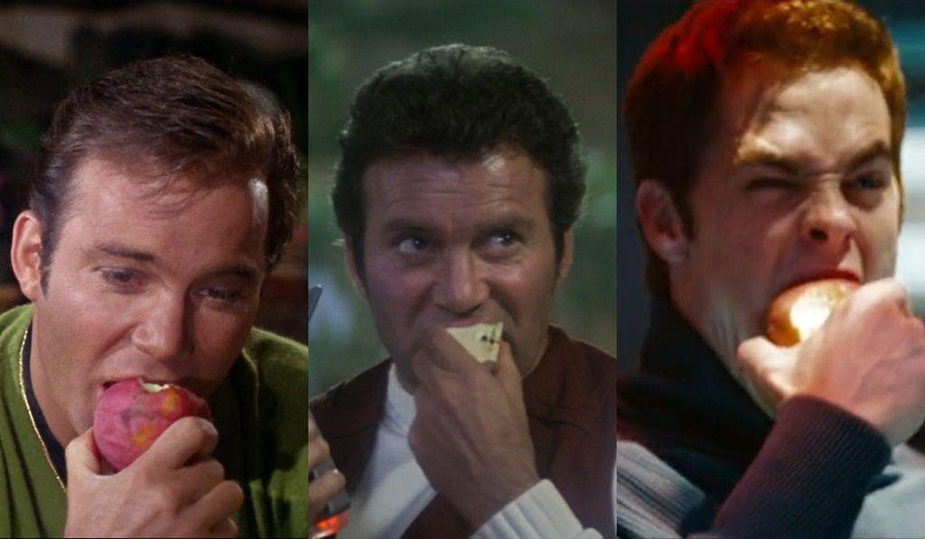 Three times on #StarTrek, Kirk calmly and confidently eats an apple while people around him are starting to lose their nerves: First in #StarTrekTOS' eponymous "The Apple"⬅️, second in "Star Trek II: The Wrath of Khan"⬆️ and third in "Star Trek '09"➡️. 🍎🍏🍎