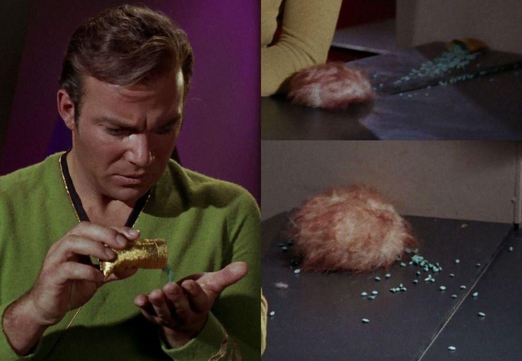 Before I talk about the food and drink seen in #StarTrekTOS' "The Trouble With Tribbles", I need to point out the blue quadrotriticale seen three times in the episode. On #StarTrek (and many other sci-fi series and films), futuristic food and beverages are usually blue. I 💙 blue gummi candy! :-)