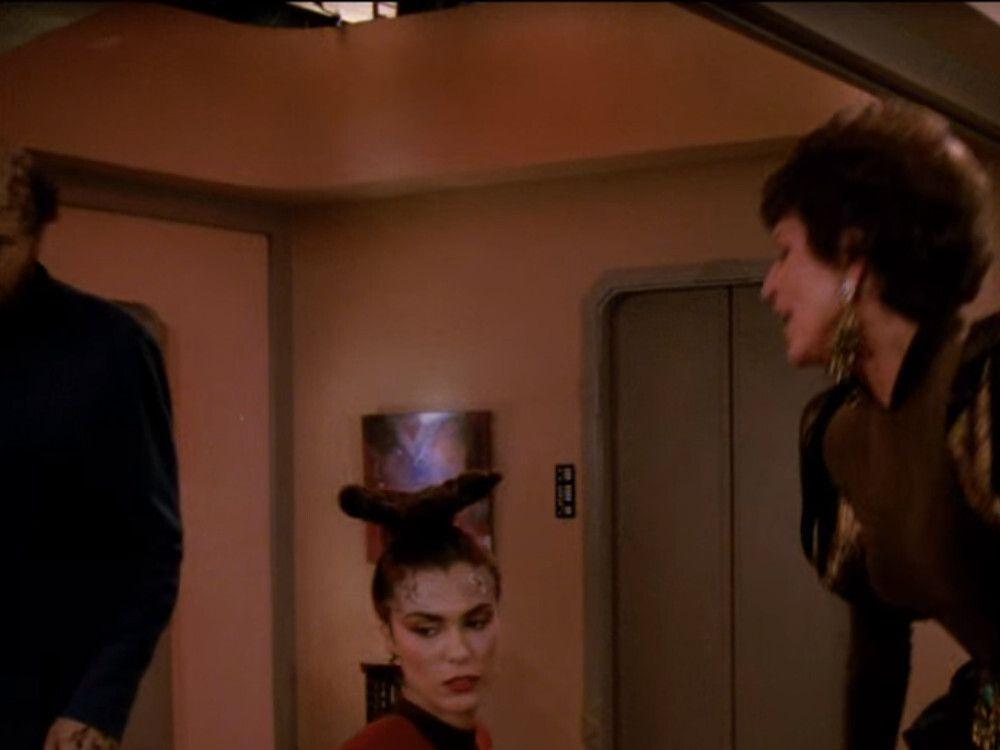 In this shot in Timicin's guest quarters in #StarTrekTNG's "Half a Life", the set border and some lighting equipment is visible ever so briefly at the top of the screenshot. Also see "Hi" to Michelle Forbes in her first #StarTrek role as Dr. Timicin's daughter Dara.