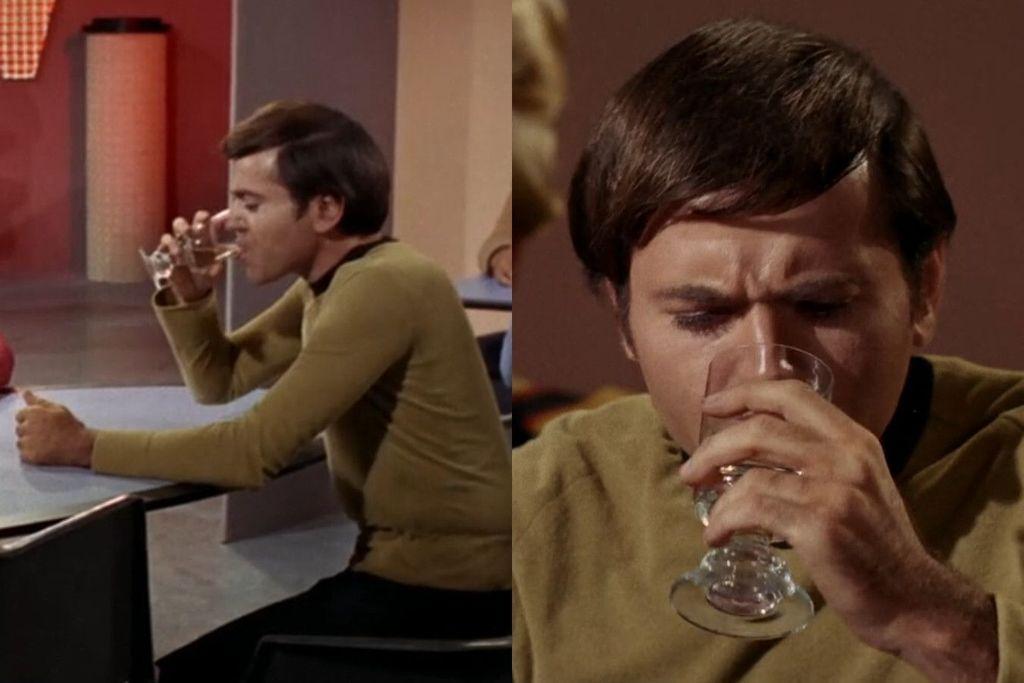 Chekov is drinking vodka in the K-7 bar in #StarTrekTOS' "The Trouble with Tribbles". This is the only time, so far, that straight vodka is seen being drunk in a #StarTrek episode or film.