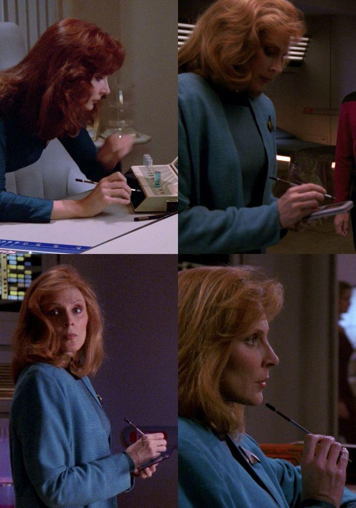 Of all the characters in all of #StarTrek, Dr. Crusher is far the character who uses a PADD stylus the most. Here you can see her using the same stylus in "The Naked Now"↖️, "Identity Crisis"↗️, "The Nth Degree"↙️ and "The Host"↘️.