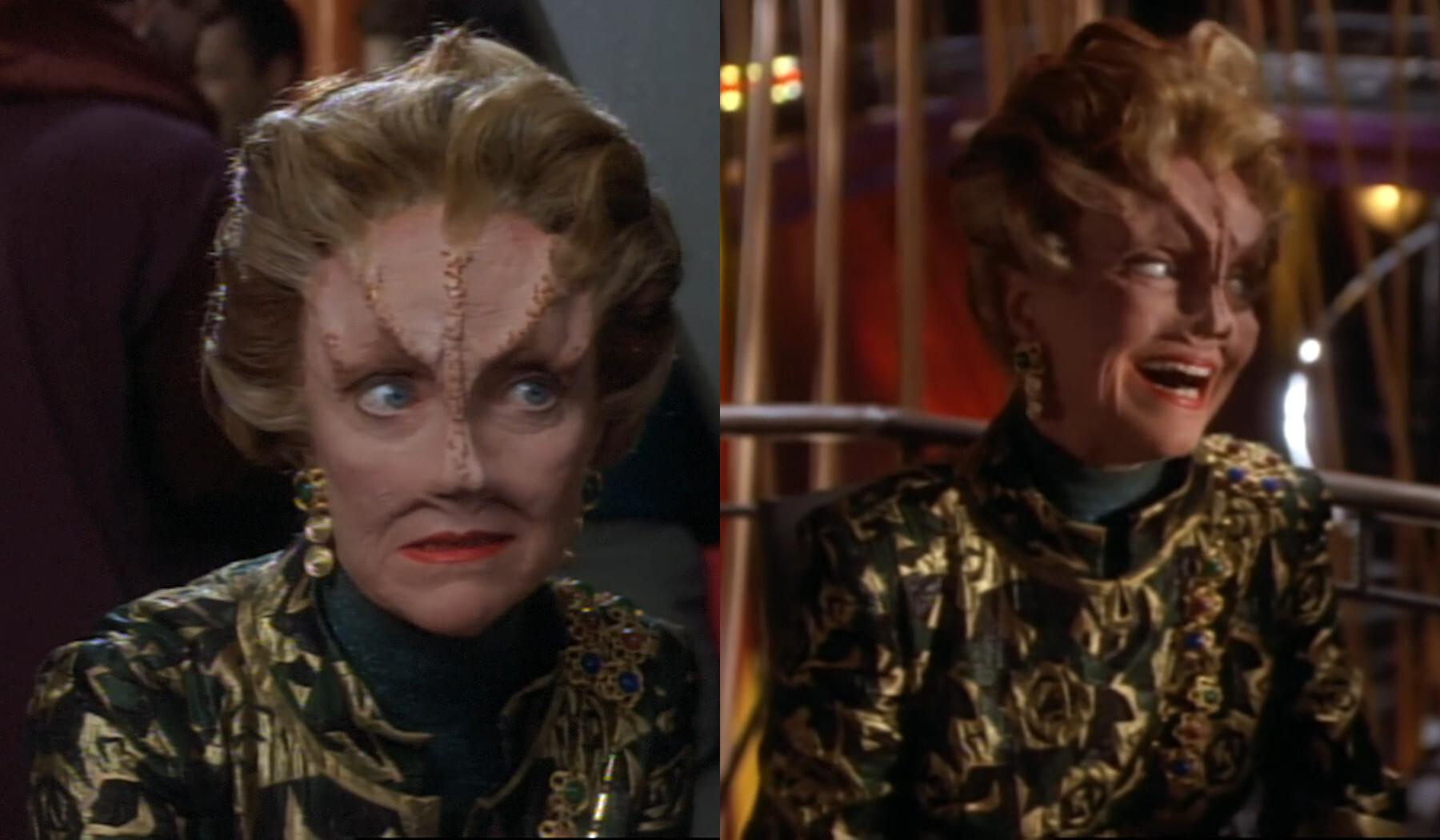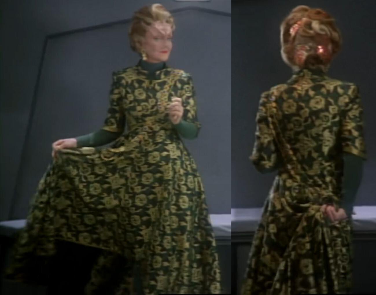 This green flower dress (the most often re-used dress in #StarTrek history) was originally created for Alsia, played by K Callan in #StarTrekDS9's "Rivals". Look how much fun she has wearing it! 😊