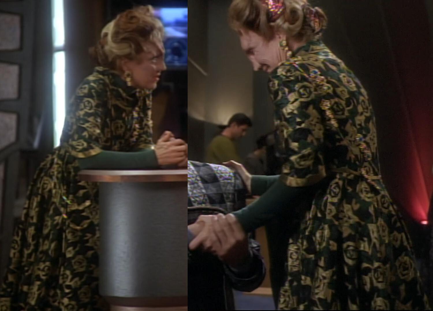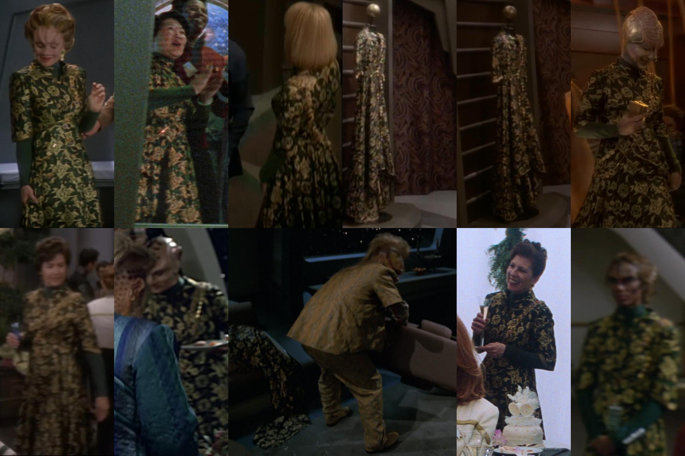 Here, finally, are all 11 appearances of the green flower dress at a glance. Apart from the dark velcro sleeve patch mentioned in the previous post, the costume was not changed over the course of 12 years of use on #StarTrek. Who wore it best (and don't say Tuvok's couch!)? 😜 11/11