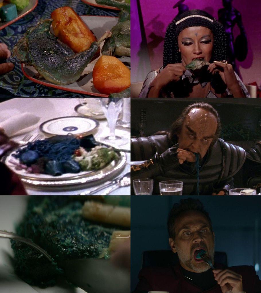Elaan quickly devouring the blue chicken meat in #StarTrekTOS' "Elaan of Troyius"↖️↗️ certainly started a recurring theme on #StarTrek. The Klingons in "Star Trek VI: The Undiscovered Country"⬅️➡️ eat blue food in a similar way and so does Captain Shaw in #StarTrekPicards's "The Next Generation"↙️↘️.