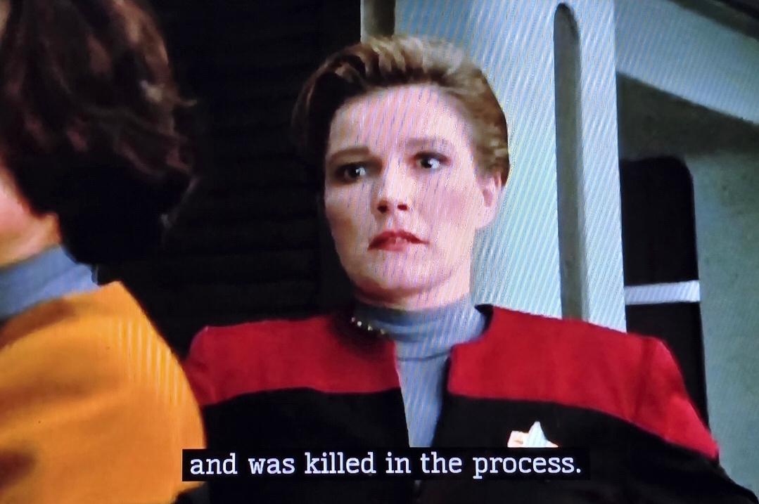 The brilliance of #KateMulgrew's acting... Upon hearing of young Ensign Kim's death, she first reacts with shock and then her voice cracks just the tiniest little bit (Captain's Composure). Harry has always had a special place in her heart. She was always hardest on Harry when he misbehaved. I wonder if the reason she never promoted him was that she was on guard to not let her personal feelings compel her to promote him. #StarTrek #StarTrekVOY