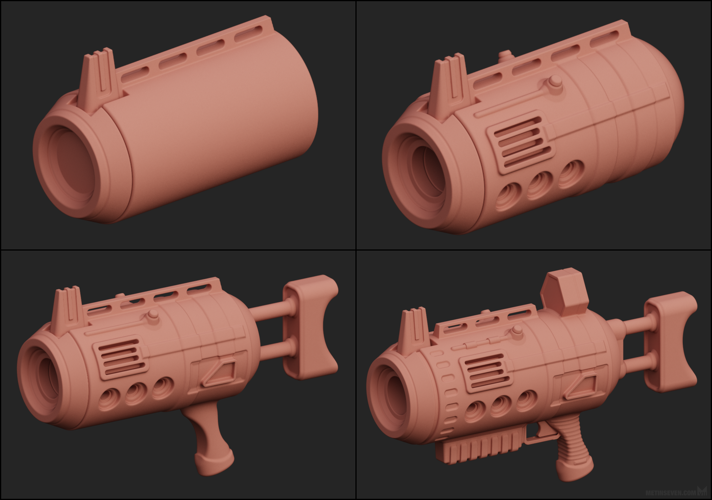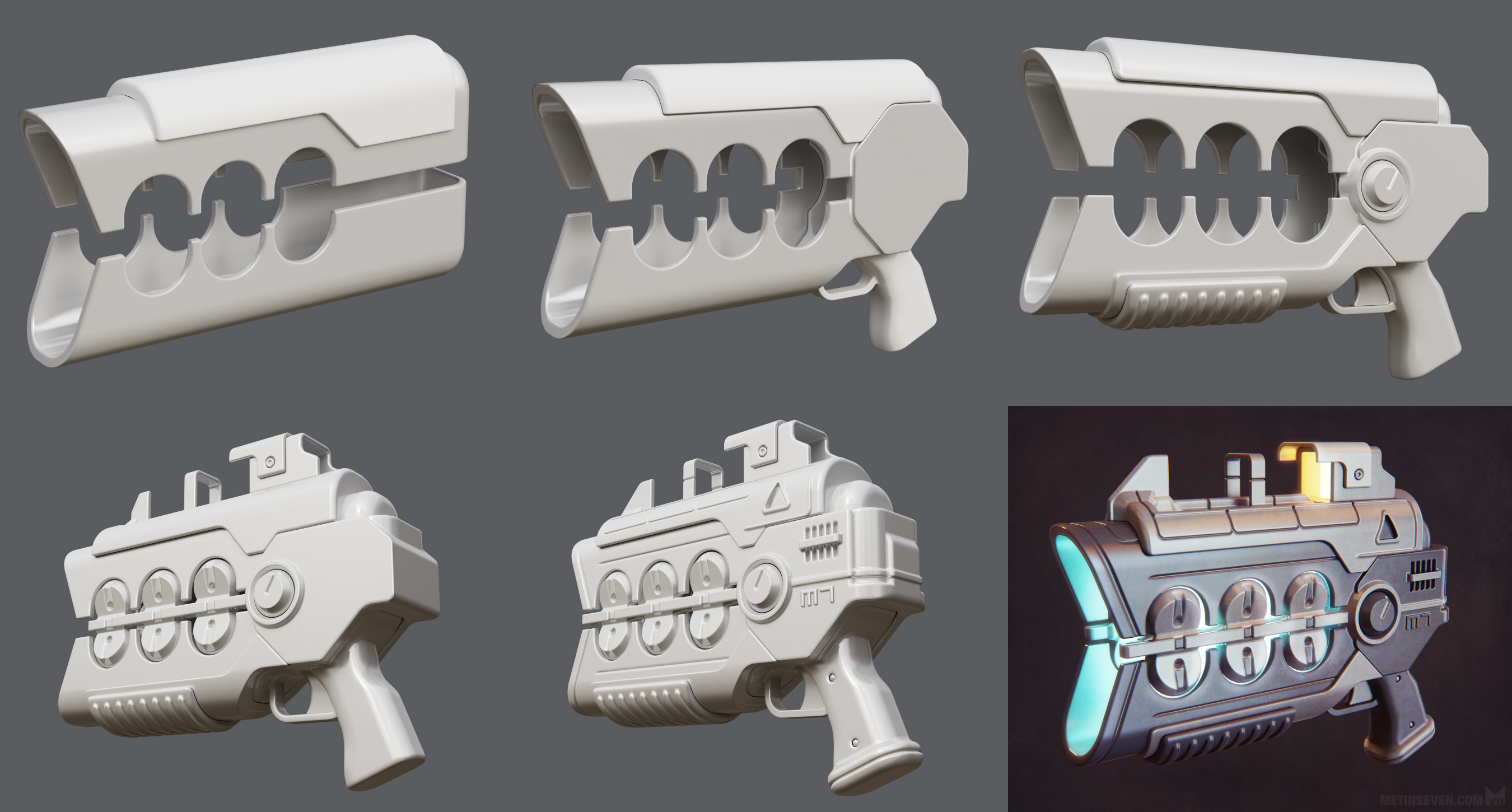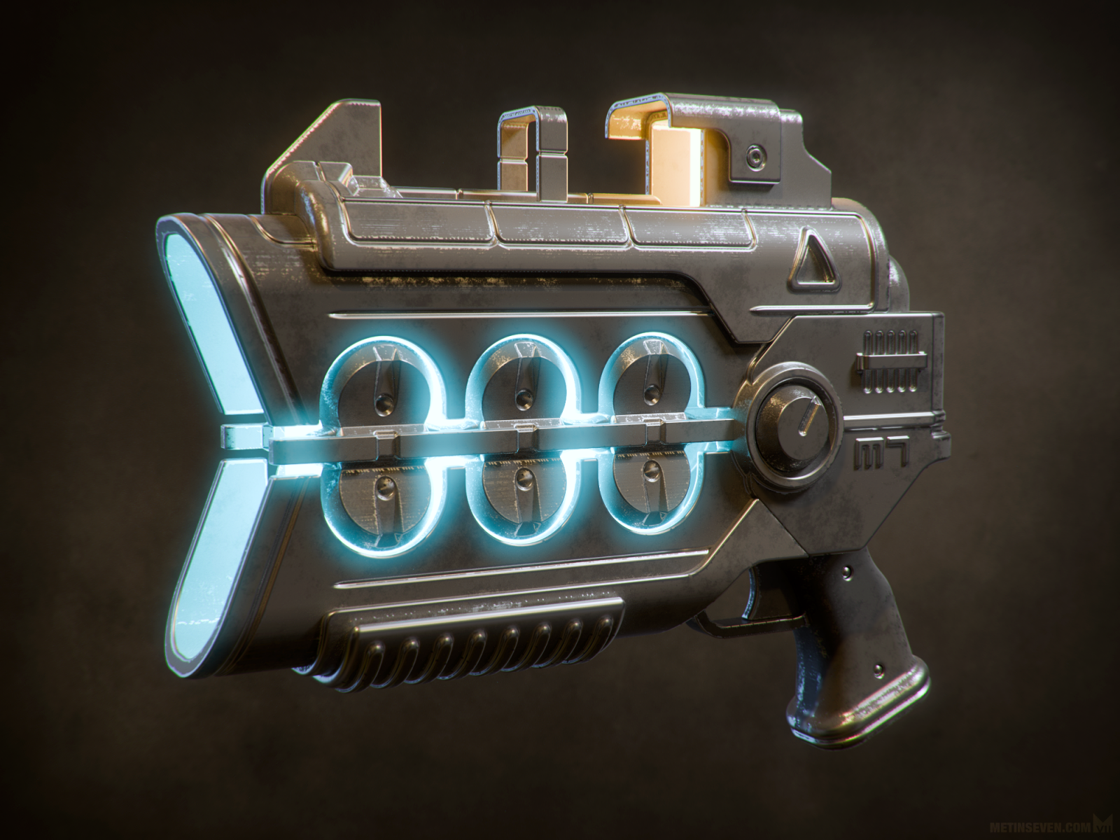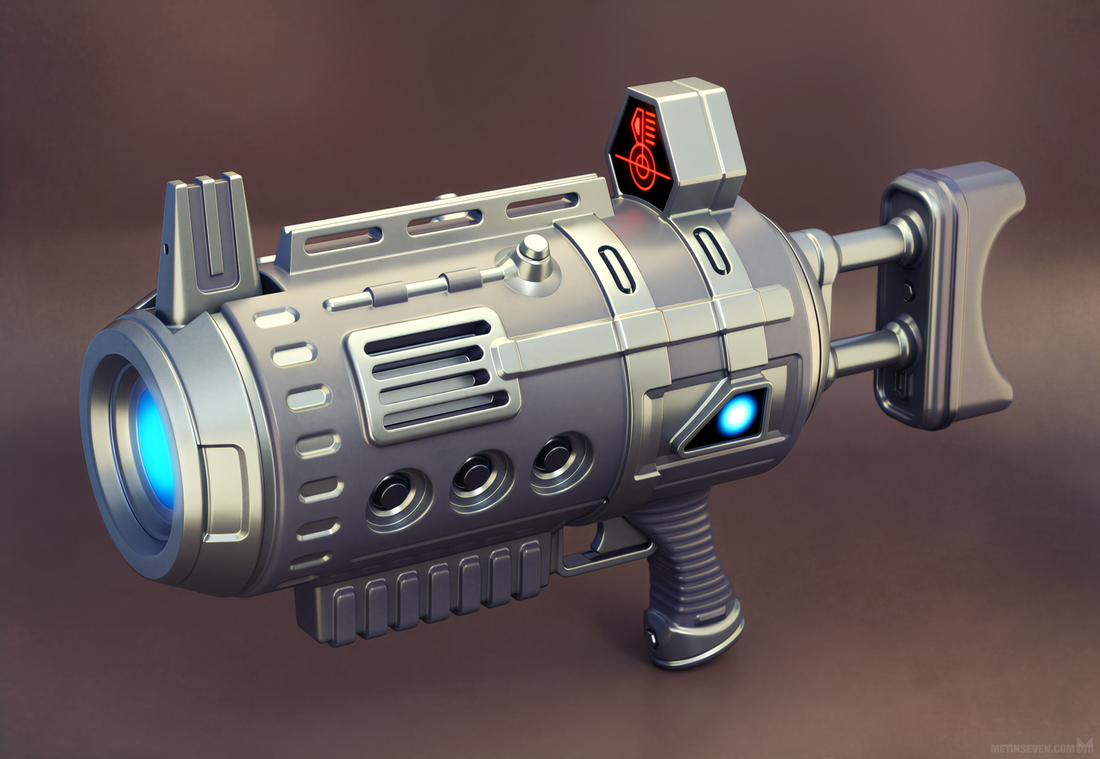 Two sci-fi ray gun designs (2024, 2025). Modeled using MagicaCSG respectively SDF Modeler. Second gun rendered using LuxCoreRender.
