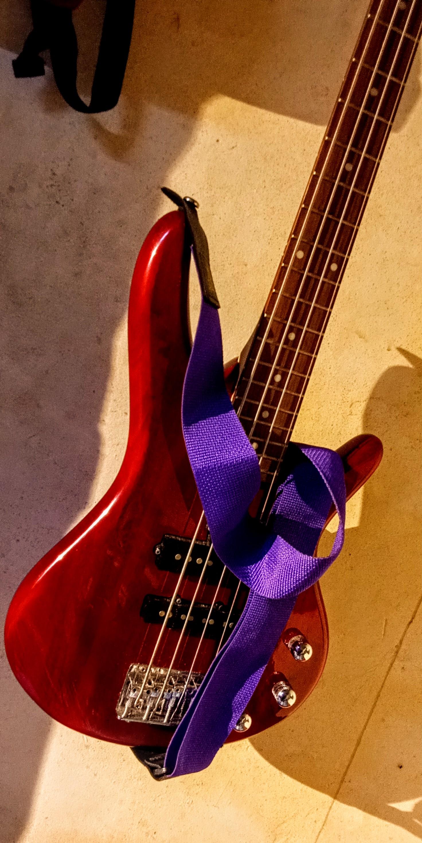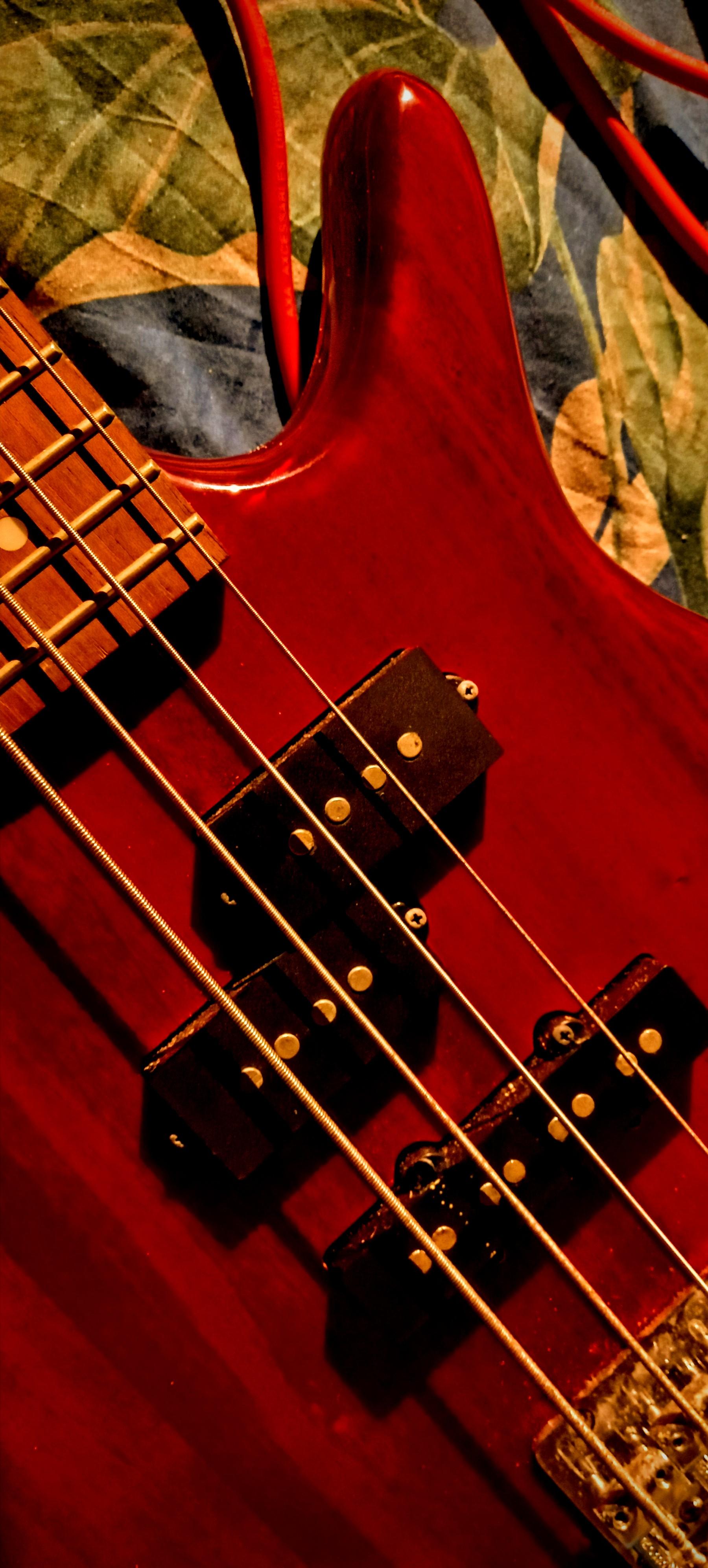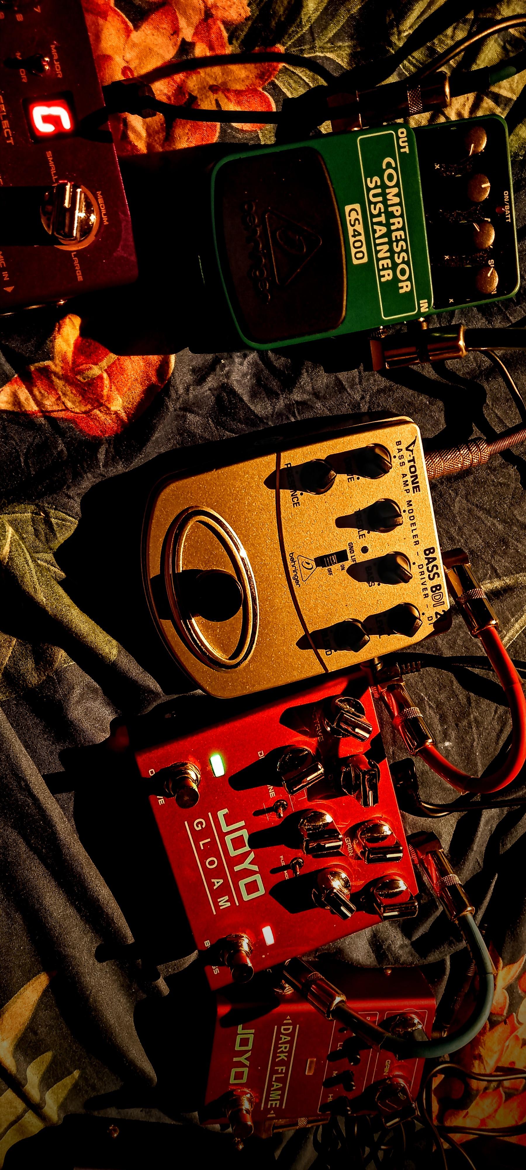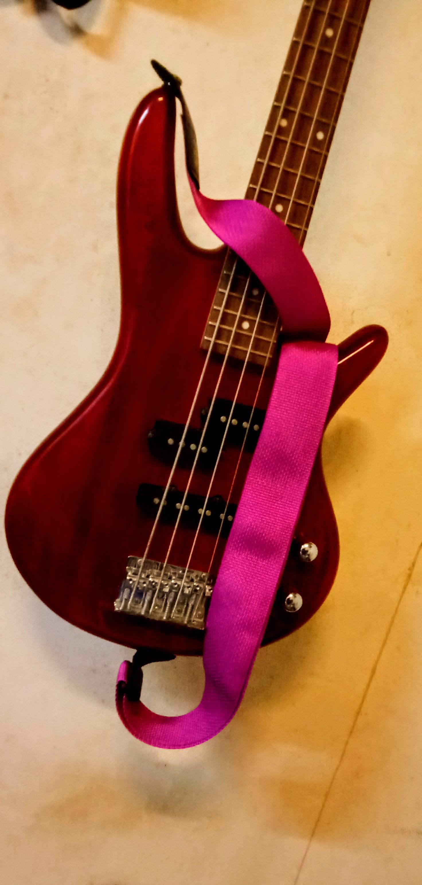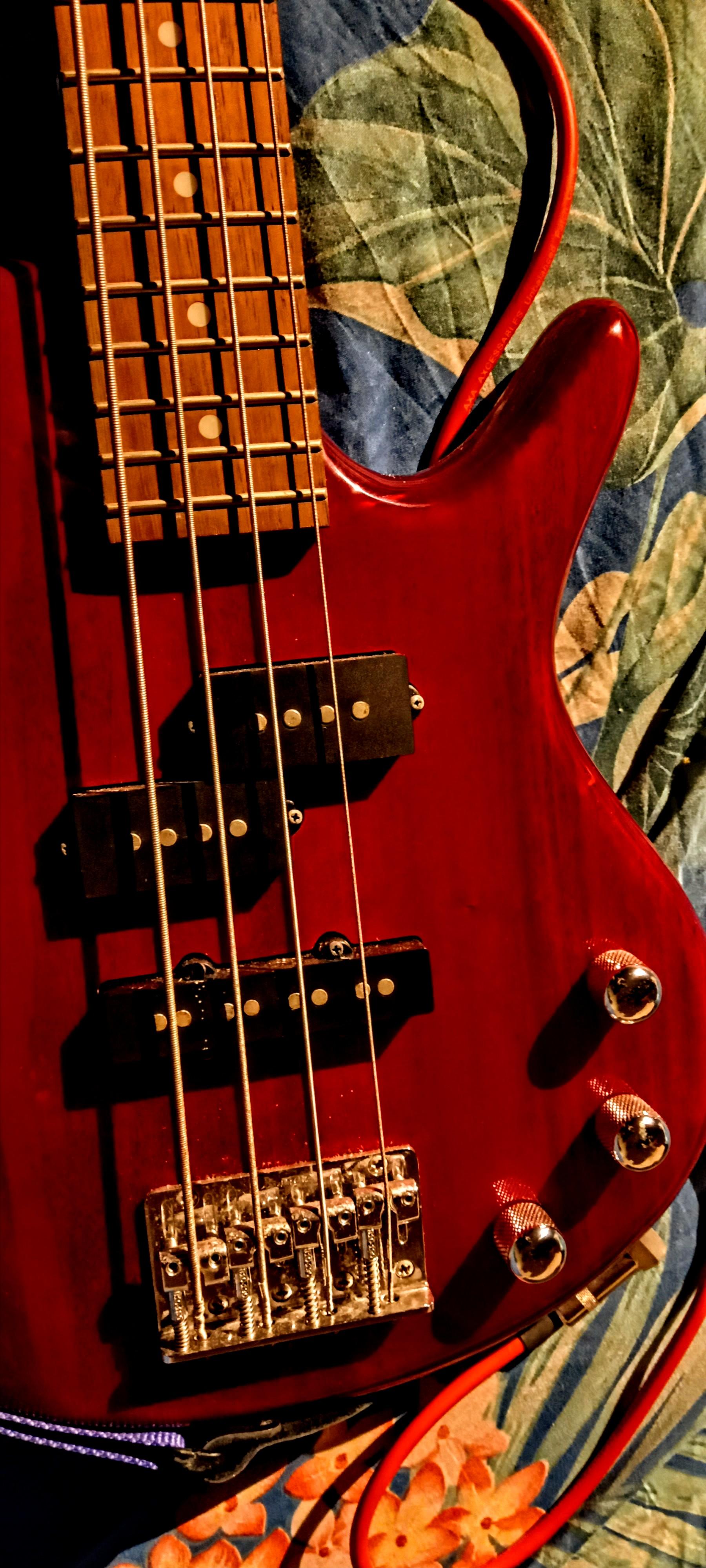 A composition of my Red Bass tinted towards Magenta, warmed up to 85F. I use JOYO pedals and various effects in my effect rack, in the signal chain.