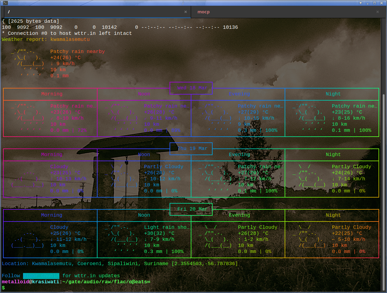 #Weather #wttr #lolcat #curl #bash #csk #ksh #zsh #sh #fish #meteorology #environment #Physics #Chemistry #Mathematics #Lineair #algebra #technology #OpenSource #programming #POSIX