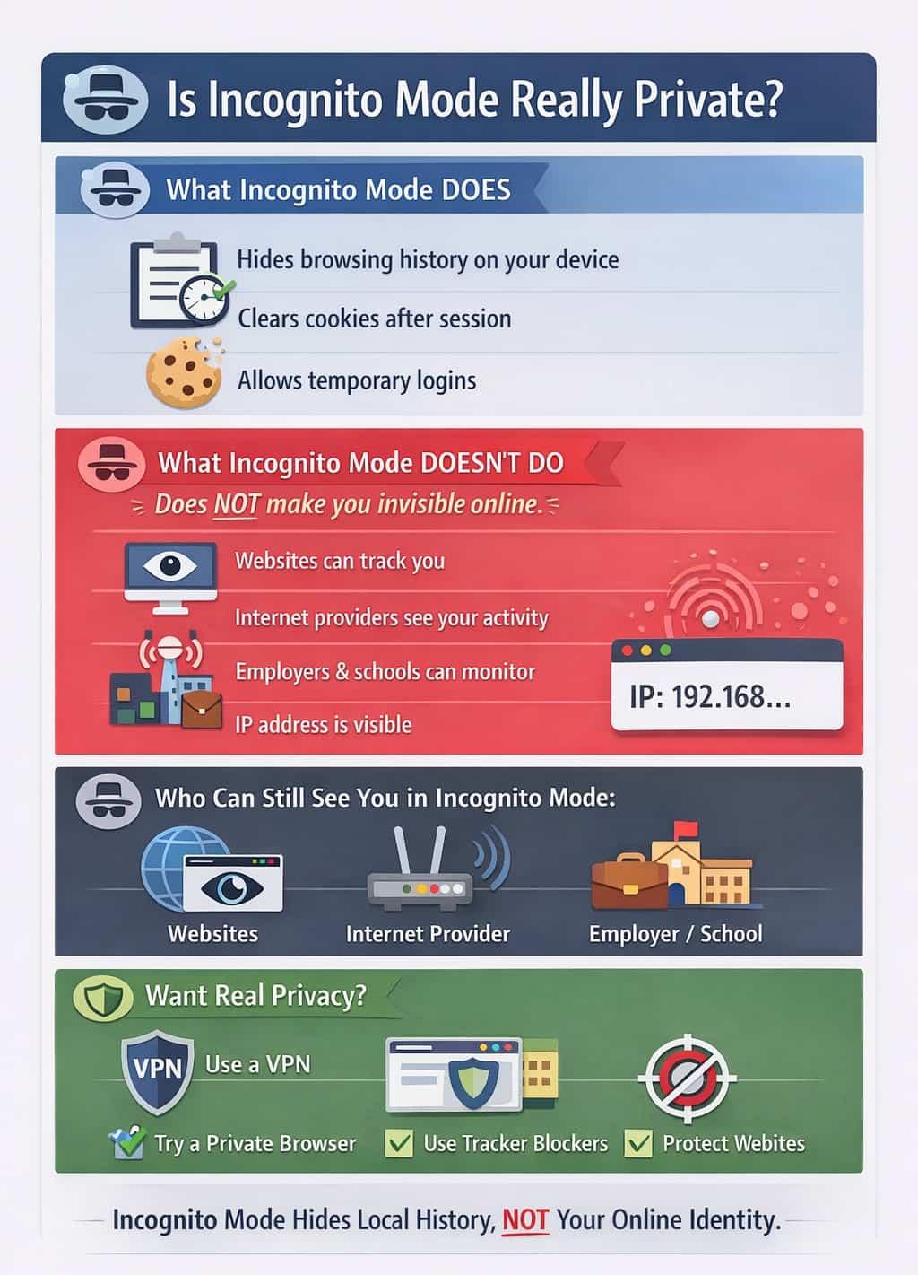 Incognito or private mode prevents your browser from saving local data, such as history, cookies, and form data, on your device, ensuring privacy from other users of that computer. However, it does not hide your activity from websites, internet service providers (ISPs), employers, or protect against malware and phishing.
