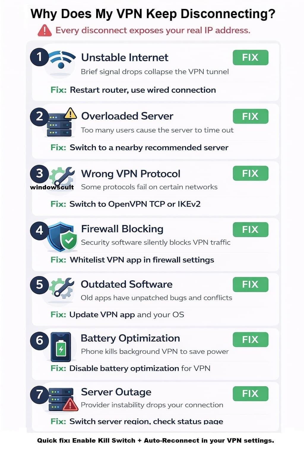 Frequent VPN dropouts not only interrupt your activities but can also put your data at risk. Here are 7 common reasons Why Your VPN Keeps Disconnecting and how to fix it. https://windows101tricks.com/why-vpn-keep-disconnecting/