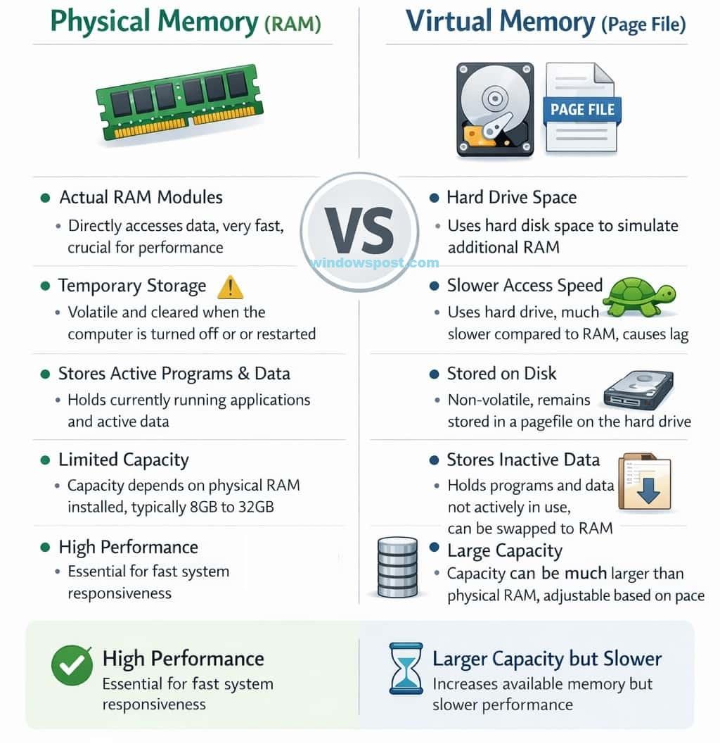 Physical memory (RAM) is the fast, limited hardware that stores active data. Virtual memory is a technique that OSs use to emulate extra RAM by using hard drive/SSD space when physical memory is full. RAM boosts performance with high-speed access, whereas virtual memory prevents crashes when RAM fills up by swapping inactive data. Read more https://windowspost.com/virtual-memory-vs-ram/