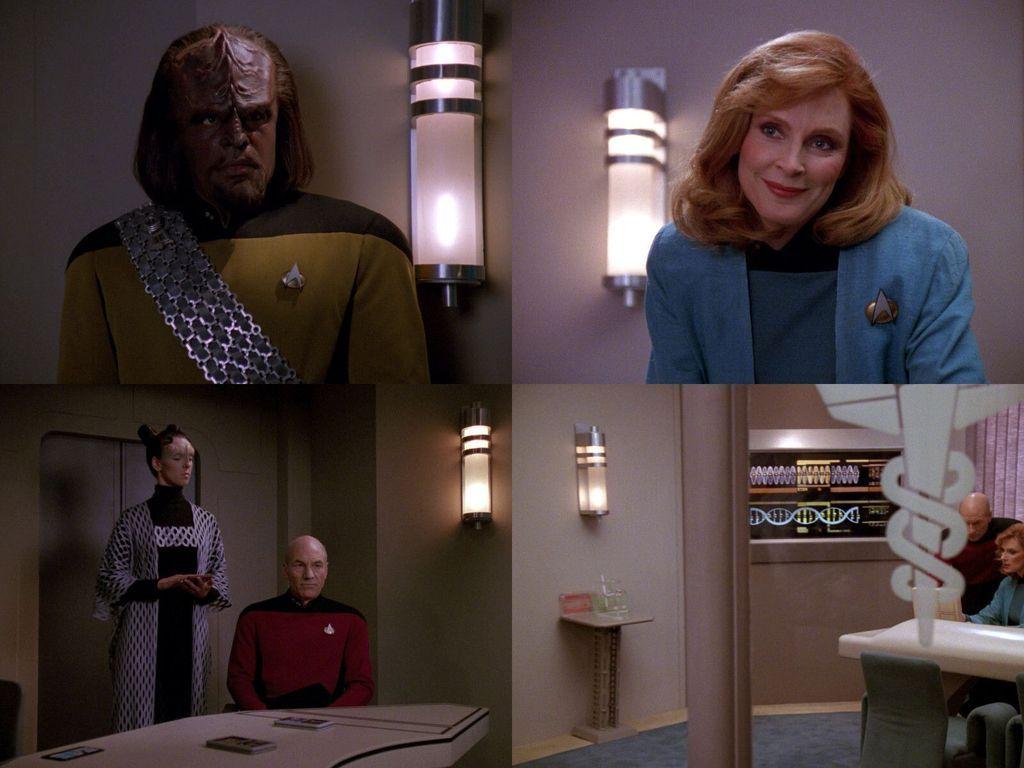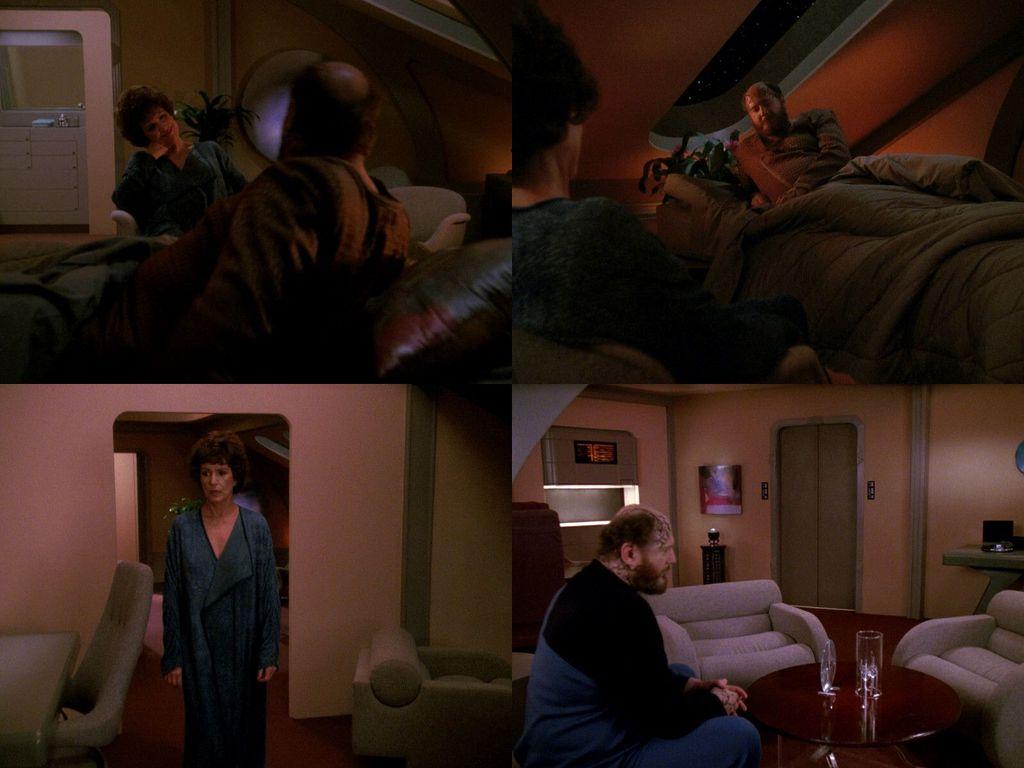 A familiar lamp that is usually seen in Dr. Crusher's sickbay office (#StarTrekTNG's "Identity Crisis"➡️) also appears in the interrogation room in "The Drumhead"⬅️. This is one of the most often seen lamps on #TNG, the other one being the Ten Forward lamp.