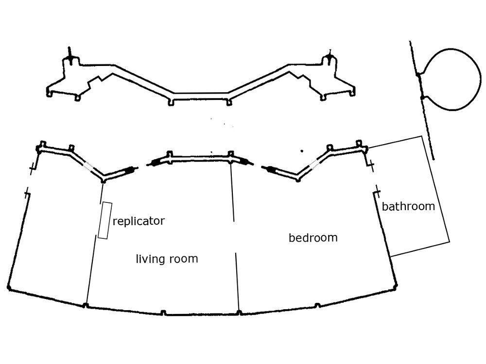 Here are a few screenshots and a set plan, showing how the senior officers' quarters set was redressed as Dr. Timicin's guest quarters in #StarTrekTNG's "Half a Life". As can be seen, he has an unusually large bedroom, twice the size of regular bedrooms seen on #TNG.