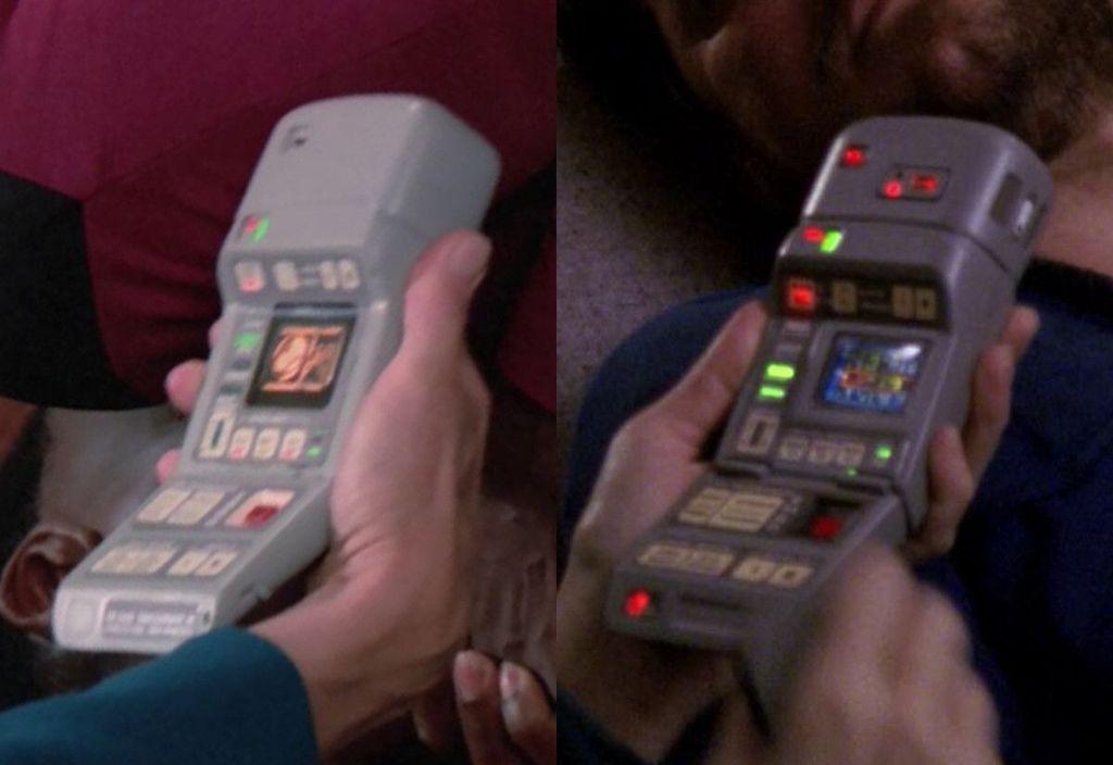 These screenshots show the differences between the older TR-560 Medical Tricorder VI ⬅️ (#StarTrekTNG's "Where Silence Has Lease"⬅️) and the latest model )as of #TNG season 4), the TR-580 Medical Tricorder VII ("The Host"➡️). Notice the beige vs. black area around the "red button".