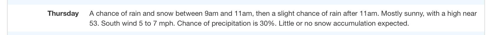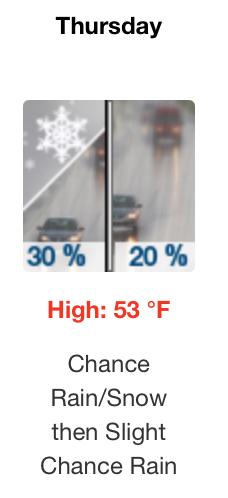 "A chance of rain and snow between 9am and 11am, then a slight chance of rain after 11am. Mostly sunny, with a high near 53. South wind 5 to 7 mph. Chance of precipitation is 30%. Little or no snow accumulation expected." 🤪
