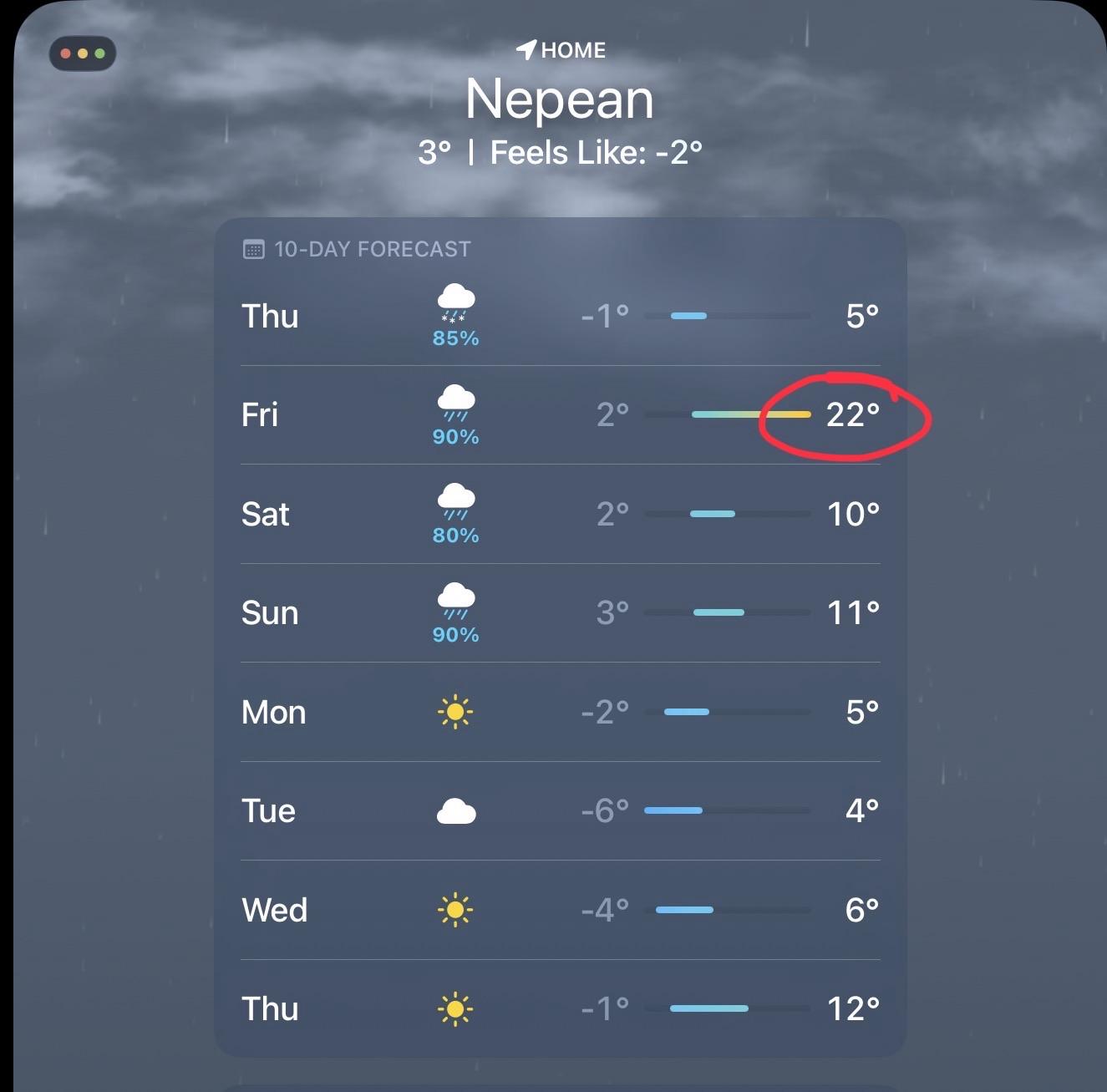 #Apple’s #weather forecast is increasingly atrocious. Last week, only 4-5 days ago, it predicted 37-45 cm of snow for coming Friday in #Ottawa, now it is forecasting +22C for that same day. I always assumed these apps all from the same database. Meanwhile Environment Canada predicts 6C and rain. #ottcity